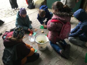 Zu Beginn unseres Abenteuers werden wir sehr fleißig sein: wir basteln Spielzeug für die Tiere und schneiden Futter, damit wir kleine Gastgeschenke in den Tiergehegen ablegen können.
